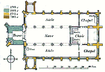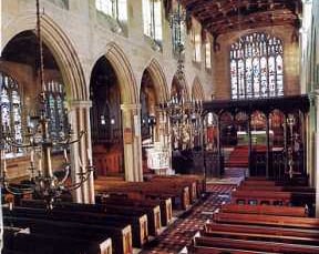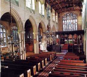 The church is a rectangular chamber with no structural divisions between the aisles and the chapels at the east end. The arcading consists of seven bays which do not extend to the east wall. The Clestory windows add greatly to the lightness of the church.