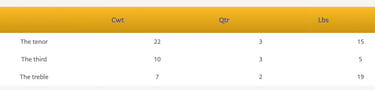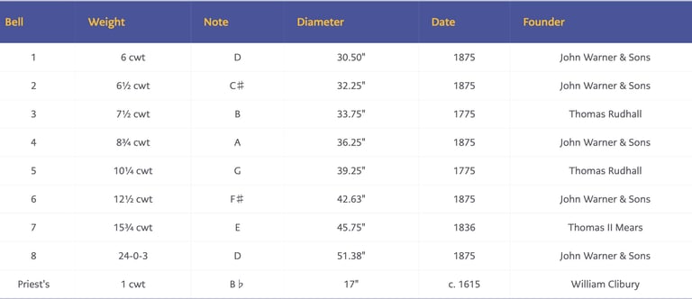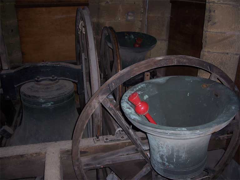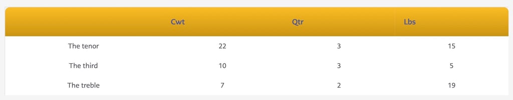 The weight of the tenor bell is estimated to be 1.2 tonnes (24 cwt). The total weight of the bells is approximately 4.7 tonnes The oak bell frame in which the bells are hung was installed in 1884. The details of the bells are as follows: