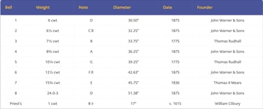 In 1875 the tenor bell was found to be cracked and the two oldest bells were so badly damaged that they needed to be replaced. In addition to replacing the damaged bells two smaller bells were cast to make a ring of eight.
