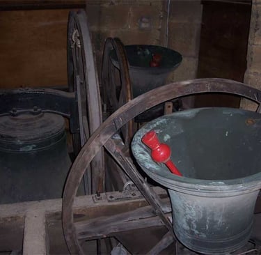 The last major refurbishment of the bells was carried out by Mears and Stainbank in 1954. It was then that the old wooden headstocks were removed and the “crowns” cut off the bells. The headstocks were replaced with cast iron and the bells were rehung on ball bearings which had been fitted in 1937. The only bell remaining with its original crown and a wooden headstock is the “Parsons” or “Prayer” bell which is inscribed “GOD SAVE HIS CHURCH”.